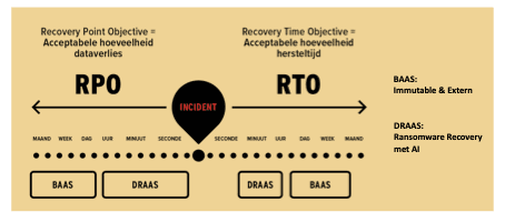 Recovery en daarmee bedrijfscontinuïteit, wordt meestal uitgedrukt in twee typen doelstellingen: Recovery Time Objective (RTO) en Recovery Point Objective (RPO). RTO geeft aan hoe lang uw organisatie zonder een bepaalde service kan, voordat dit leidt tot verlies of risico. RPO bepaalt vanaf welk moment uw data kan worden hersteld. Waar traditionele back-up- en snapshotoplossingen een RPO van 15 minuten tot wel 24 uur bieden, zijn de eisen in moderne digitale omgevingen veel strenger. Zowel RTO als RPO moeten hier zo kort mogelijk zijn – het liefst uitgedrukt in minuten of zelfs seconden. Veel organisaties richten zich op een snelle herstart (RTO), maar denken er hierbij niet aan dat het niet kunnen herstellen van verloren data (RPO) langdurige gevolgen kan hebben.