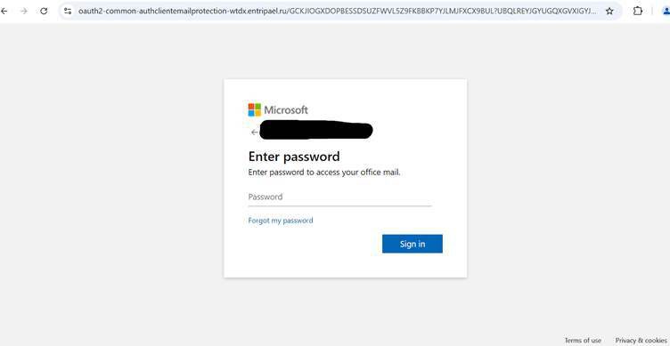 Als de ontvanger op de link zou klikken, wordt hij doorgestuurd naar een nagebootste Microsoft-landingspagina die wordt gebruikt voor het verzamelen van inloggegevens. U kunt in de URL zien dat dit wordt gehost op een Russisch TLD, wat hieronder verder wordt toegelicht.