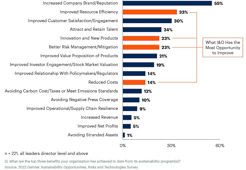 "De kernfocus van veel ondernemingen met een duurzaamheidsstrategie is eigenlijk hoe ze deze kunnen gebruiken om innovatie, differentiatie en groei te stimuleren door middel van nieuwe producten en bedrijfsmodellen", aldus Stanish. "Maar minder dan de helft van de I&O-leiders die we spreken, profiteert momenteel van de zakelijke voordelen die verder gaan dan lagere energiekosten."