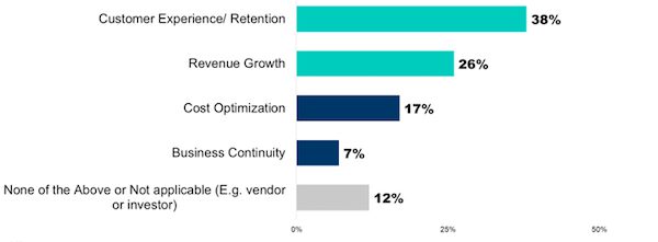 Ondanks aanhoudende economische tegenwind meldt slechts 17% van de leidinggevenden aan dat kostenoptimalisatie het primaire doel is van investeringen in generatieve AI. Klantervaring is de meest voorkomende primaire focus van investeringen, genoemd door 38% van de respondenten (zie figuur 1).