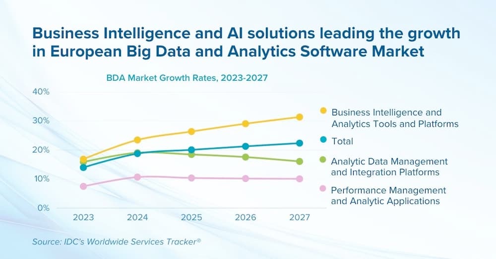 IDC verwacht dat de Europese vooruitzichten gaan verbeteren, met een groei van 14% in 2023 en een opwaartse trend in de volgende jaren. Dit leidt naar verwachting tot een samengesteld jaarlijks groeipercentage (CAGR) van 20,8% voor West-Europa en 19% voor Centraal- en Oost-Europa in de periode 2023–2027. De ongeremde groei van data-analyse en AI-oplossingen stimuleert op zijn beurt de vraag naar tools en platforms voor business intelligence en analyse stimuleren. De andere twee markten blijven hierdoor aanzienlijk achter.