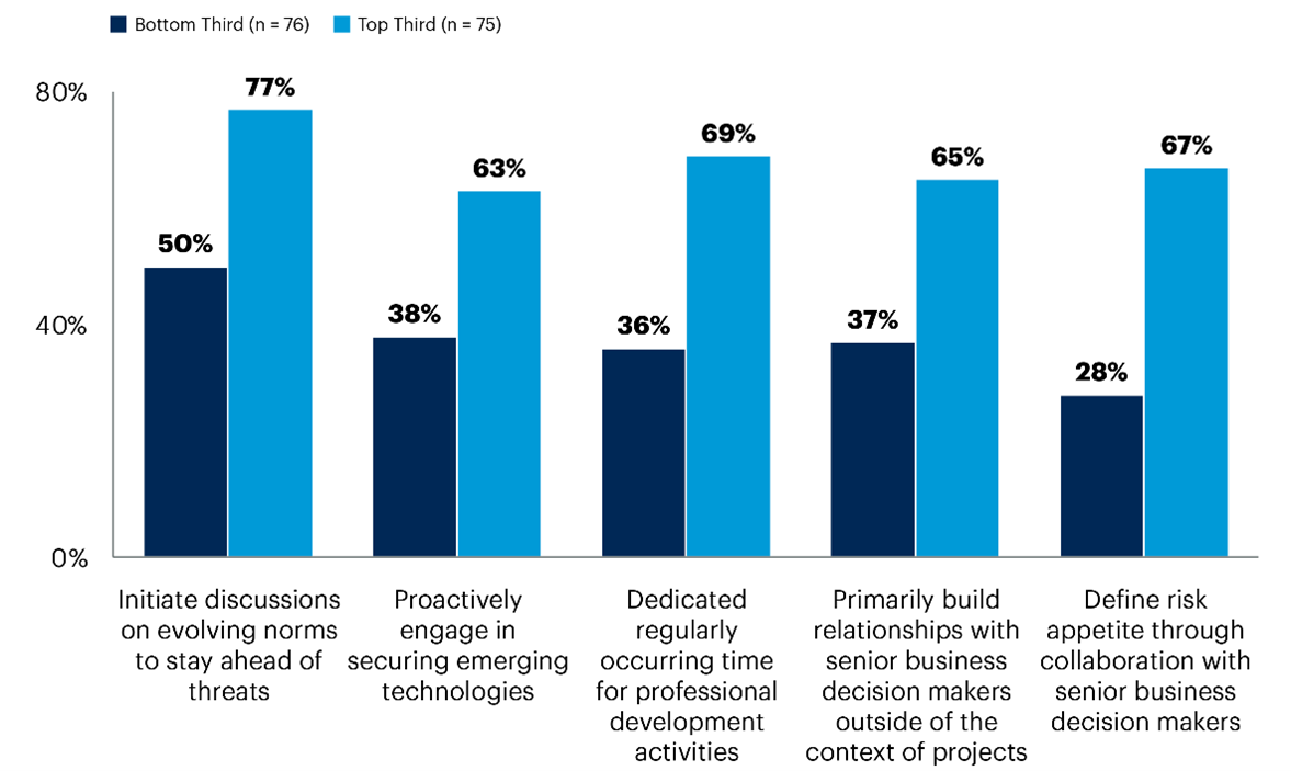 Het onderzoek identificeerde vijf belangrijke gedragingen die de best presterende CISO’s aanzienlijk onderscheiden van de slechtst presterende. Gemiddeld komt elk van deze gedragingen minstens anderhalf keer zo vaak voor bij toppresteerders als bij slechtst presterende bedrijven (zie figuur 1).