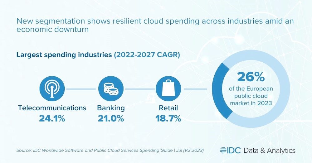 Het bankwezen, de detailhandel en de telecommunicatie geven in 2023 het meeste uit aan de public cloud en zijn goed voor 26% van de totale marktwaarde. Telecommunicatiebedrijven zijn minder getroffen door hogere energieprijzen dan andere sectoren. Ook blijft de schuldaflossing in de telecomsector laag en blijven de kosten die verband houden met hogere rentetarieven beperkt, waardoor de partijen eenvoudiger IT-budgetten kunnen vrijmaken. IDC verwacht dat de public cloud-investeringen in de telecommunicatiesector in 2024 sterk groeien, waardoor deze sector samen met onder meer biowetenschappen, nutsbedrijven en gezondheidszorgbetalers tot de sectoren met de hoogste uitgaven zal behoren.
