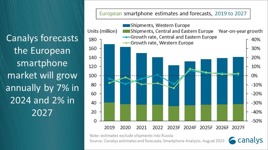Canalys voorspelt dat de jaarlijkse groei van de Europese smartphonemarkt (exclusief Rusland) in 2024 7% bereikt en in 2027 vertraagt tot 2%, wanneer de volumes zich zullen herstellen naar het niveau van 2022. “Uiteindelijk zullen leveranciers die blijk geven van veerkracht in de huidige marktomgeving en het vermogen om zich snel aan te passen aan nieuwe regelgeving, zichzelf bewijzen als sterke langetermijnpartners van het kanaal”, concludeert Bjørhovde.