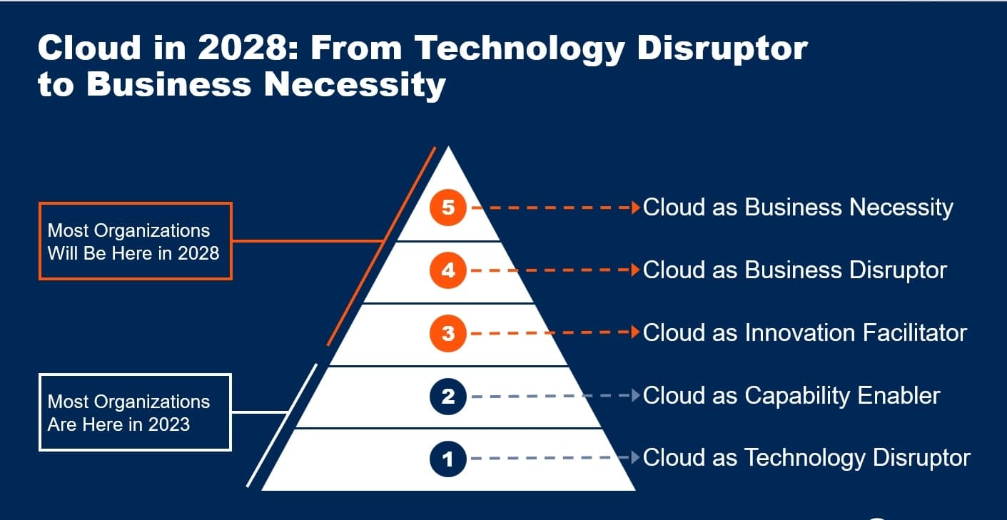 De meeste bedrijven beschouwen de cloud momenteel als een technologieplatform. In 2023 gebruiken organisaties cloud computing als technologieverstorende of faciliterende factor. Gartner voorspelt dat meer dan 50% van de bedrijven in 2028 cloudplatforms in de sector zal gebruiken om hun bedrijfsinitiatieven te versnellen. In 2028 zetten de meeste organisaties de cloud in als zakelijke noodzaak (zie figuur 1).
