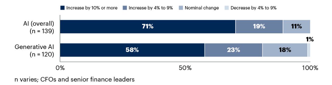 Negen op de tien CFO's verwacht meer budget voor AI te hebben in 2024. Ruim zeven op de tien (71%) wil zijn AI-investeringen met 10% of meer verhogen ten opzichte van vorig jaar. Generatieve AI krijgt de focus; 81% verwacht meer uit te geven op dit gebied.