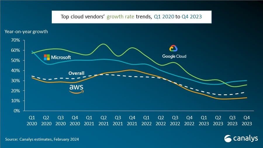 Microsoft Azure is de op een na grootste cloudserviceprovider en zag zijn marktaandeel stijgen naar 26% in Q4 2023, ten opzichte van 23% in Q4 2022. De toename in adoptie van AI stimuleert de omzet van Azure met 30% in vergelijking met Q4 2022. Azure breidde zijn ondersteuning uit voor de nieuwste modellen van OpenAI in Q4, waaronder GPT-4 Turbo, GPT-4 met Vision en Dall-E 3. Het biedt nu ook mogelijkheden voor fine-tuning. Het heeft 53.000 Azure AI-klanten aangetrokken, waarvan meer dan een derde in de afgelopen 12 maanden is verworven. Canalys verwacht dat het groeimomentum van Azure aanhoudt. Microsoft kondigde op 16 januari 2024 aan dat Copilot voor Microsoft 365 algemeen beschikbaar is via alle verkoopkanalen. Deze stap heeft tot doel de toegang voor klanten te vergroten en extra kansen te creëren voor de partners die hen bedienen.