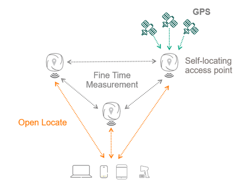 Een zelf lokaliserend access point met een verbinding met GPS-satellieten is alles wat nodig is om de posities van andere access points en eindapparaten met behulp van FTM nauwkeurig te bepalen
