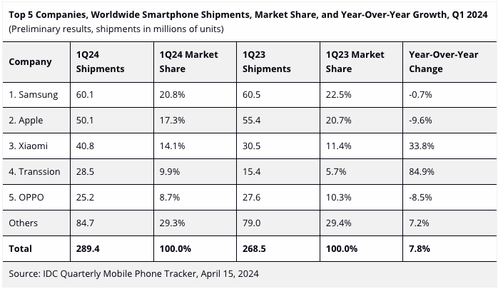 Het Chinese Xiaomi zag de vraag naar zijn smartphones met 33,8% stijgen. Het bedrijf verscheepte 40,8 miljoen smartphones. De snelste groeier is echter het eveneens Chinese Transsion, dat met 28,5 miljoen exemplaren 84,9% meer smartphones verscheepte.