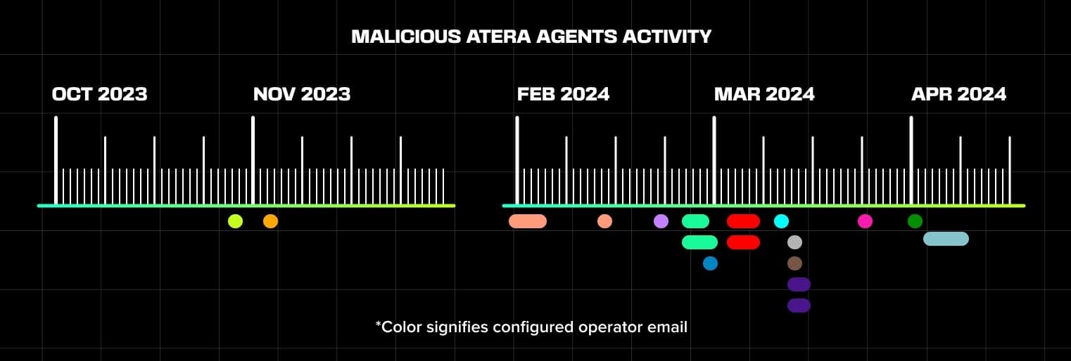 De onderzoekers ontdekten een aanzienlijke toename van het aantal installatiepakketten van de RMM-tool Atera Agent sinds oktober 2023. In de afgelopen zes maanden heeft MuddyWater het gebruik van legitieme RMM-software verfijnd en de frequentie van hun aanvallen opgevoerd. De leden van MuddyWater gebruiken de gratis proefversie van Atera Agent en registreren zich via gecompromitteerde e-mailaccounts, zowel zakelijke als privé, om de machines van de slachtoffers binnen te dringen.