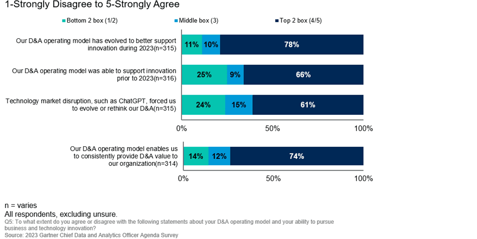 Dit blijkt uit het jaarlijkse Gartner Chief Data & Analytics Officer (CDAO)-onderzoek, dat van september tot en met november 2023 is uitgevoerd onder 479 Chief Data and Analytics Officers, Chief Data Officers (CDO) en Chief Analytics Officers (CAO) wereldwijd. Op de vraag welke veranderingen CDAO's moeten aanbrengen in hun D&A-bedrijfsmodel om geschikt te zijn voor huidige en toekomstige doeleinden, zegt vier op de tien (38%) CDAO's dat hun D&A-architectuur de komende twaalf tot achttien maanden wordt herzien. Negenentwintig procent van de respondenten gaat de manier waarop zij data-assets beheren vernieuwen en governancebeleid, -praktijken en -standaarden adopteren en toepassen.