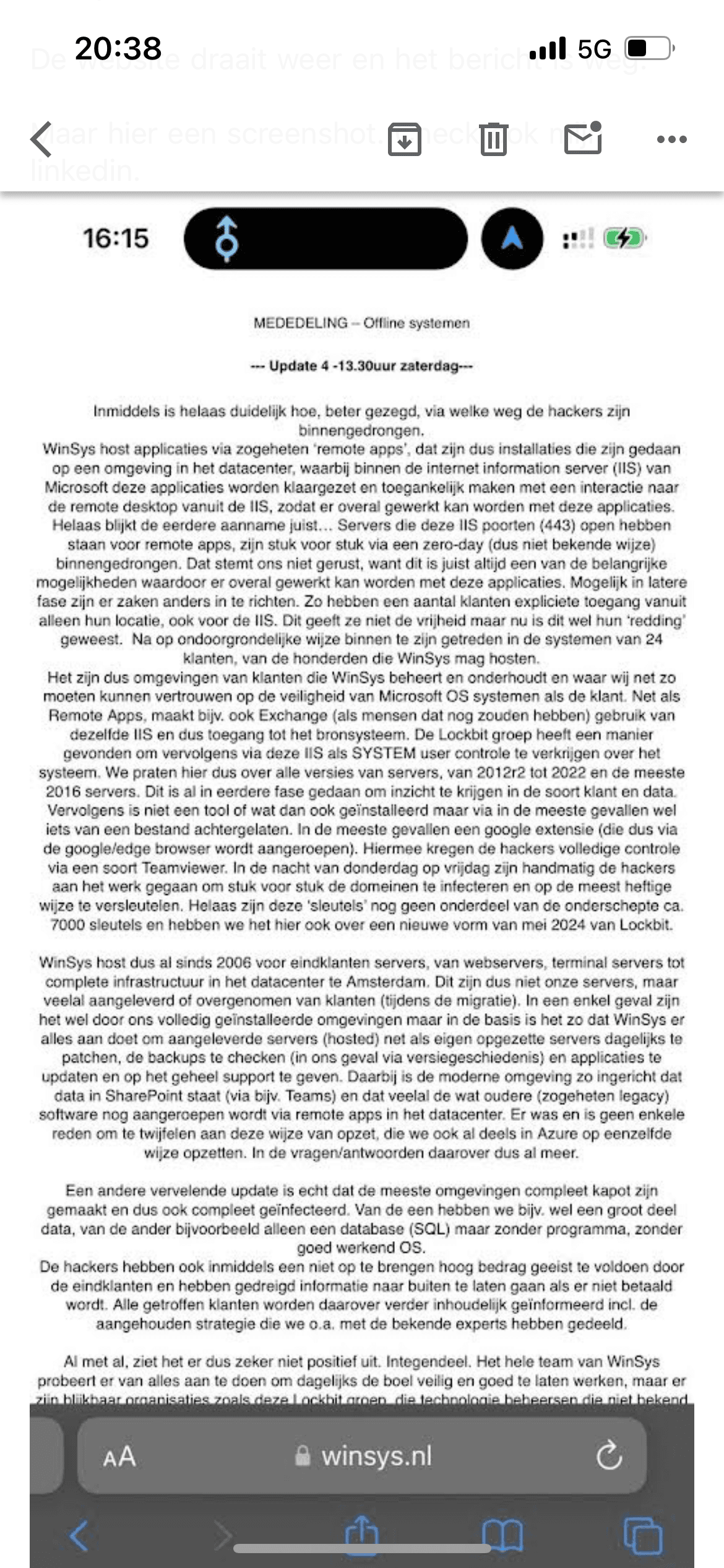 ‘We zijn dus op dit moment NIET bereikbaar en zullen eerst goed in kaart brengen wat de schade is en hoe we dit kunnen beperken en acties uitzetten.