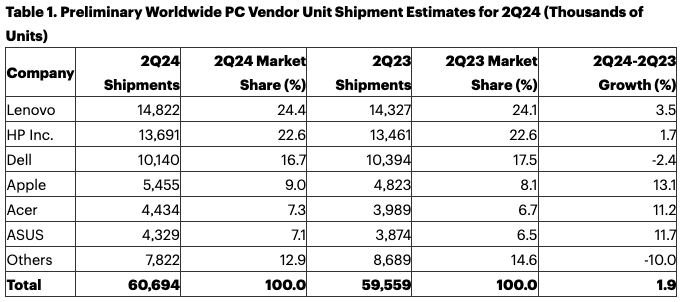 60,6 miljoen pc's zijn in het tweede kwartaal van 2024 verscheept. Dit is 1,9% meerdan in dezelfde periode een jaar eerder. Daarmee is Q2 het derde opeenvolgende kwartaal van groei op jaarbasis voor de pc-markt.