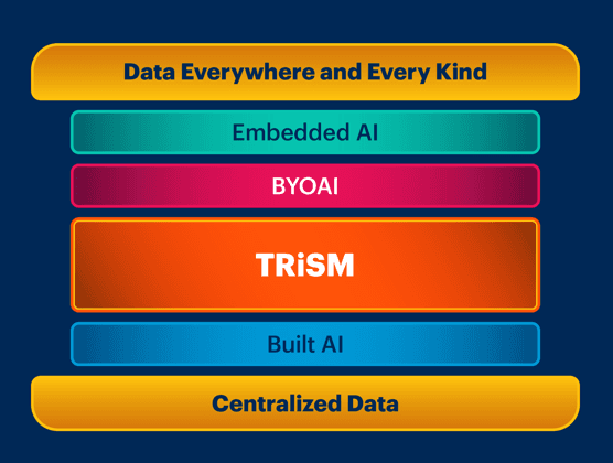 AI en data zijn tegenwoordig verspreid door de hele organisatie, en slechts 35% van de AI-mogelijkheden wordt door IT-teams ontwikkeld. Dit vereist nieuwe benaderingen voor het beheer van datatoegang en het toezicht op AI-in- en output om veilig AI-waarde te leveren. Plummer introduceert het concept van een 'tech sandwich': de centrale IT-data en AI onderaan, de verspreide data en AI bovenaan, en daartussen de TRiSM-technologieën (trust, risk en security management) voor veiligheid. Volgens Mullery kunnen AI-steady organisaties dit beheren met teams en commissies, terwijl AI-versnelde organisaties TRiSM-technologieën moeten toevoegen.