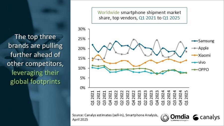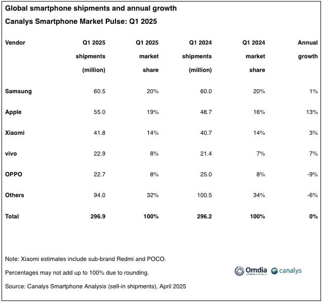 Dit blijkt uit cijfers die marktonderzoeker Canalys deelt. Samsung behoudt de leiding met 60,5 miljoen verzonden eenheden, ondersteund door de lancering van hun nieuwste high-end modellen en competitief geprijsde nieuwe A-serie producten. Apple staat op de tweede plaats met 55,0 miljoen verzonden eenheden en een marktaandeel van 19%, aangedreven door groei in opkomende Aziatisch-Pacifische markten en de Verenigde Staten. Xiaomi bevestigt zijn derde plaats met 41,8 miljoen verzonden eenheden en een marktaandeel van 14%, door middel van hun diverse productecosysteem om hun merk te versterken in vasteland China en opkomende buitenlandse markten. vivo en OPPO volgen op de vierde en vijfde plaats, met respectievelijk 22,9 miljoen en 22,7 miljoen verzonden eenheden.