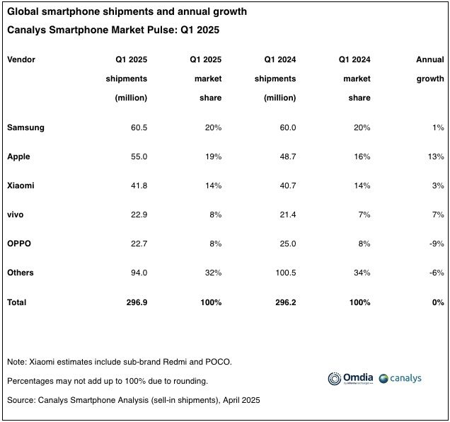 De wereldwijde smartphonemarkt is in het eerste kwartaal van 2025 met 0,2% gegroeid. In totaal zijn 296,9 miljoen smartphones verscheept. Na het einde van de piek in de vervangingscyclus en met fabrikanten die zich richtten op gezondere voorraadniveaus, vertraagde de groei van de smartphonemarkt voor het derde kwartaal op rij. Samsung is opnieuw marktleider.