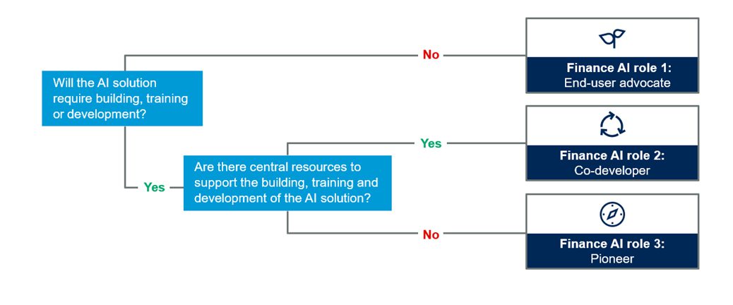 Bij AI-initiatieven die specifiek zijn voor de financiële functie, ontstaan verschillende rollen afhankelijk van twee hoofdfactoren. De eerste factor om te overwegen is of de AI-oplossing bouwen, trainen of andere vormen van aangepaste ontwikkeling vereist. Als enige aanpassing vereist is, komt een tweede factor in het spel. Zijn er centrale middelen die de vereiste training en ontwikkeling van de AI-oplossing zullen ondersteunen.