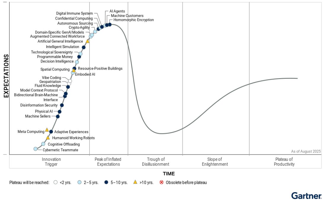 Veel van de belangrijkste technologische innovaties van dit jaar ondersteunen autonome bedrijfsvoering, blijkt uit de 2025 Hype Cycle for Emerging Technologies van Gartner. Denk hierbij aan machine customers, AI-agents, decision intelligence en 'programmeerbaar geld'.