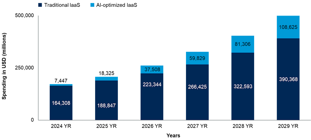 AI-geoptimaliseerde IaaS omvat hardware zoals grafische processors (GPUs), application-specific integrated circuits (ASICs) en andere versnellers die geschikt zijn voor grootschalige AI-toepassingen. Traditionele cloudinfrastructuur, gebaseerd op centrale processors (CPUs), kan volgens Gartner moeilijk voldoen aan de groeiende behoefte aan gespecialiseerde rekenkracht voor AI en generatieve AI.