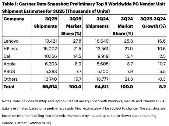 De rangschikking van de vijf grootste fabrikanten bleef ongewijzigd in het derde kwartaal van 2025. Lenovo behaalde de sterkste groei met een jaarlijkse stijging van 16,6% in wereldwijde leveringen. Alle vijf grootste leveranciers zagen hun verzendingen toenemen.