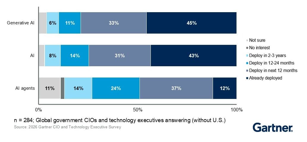 De top vier technologieën waaroverheden volgend jaar meer in willen investeren, zijn cybersecurity (85 procent), AI (80 procent), generatieve AI (80 procent) en cloudplatforms (76 procent). Uit de enquête blijkt dat 74 procent van de overheids-CIO’s AI al heeft geïmplementeerd of dat binnen twaalf maanden plant te doen. Voor generatieve AI ligt dit percentage op 78 procent. Ook de interesse in AI-agents groeit: 49 procent geeft aan deze nu of binnen een jaar in te zetten.