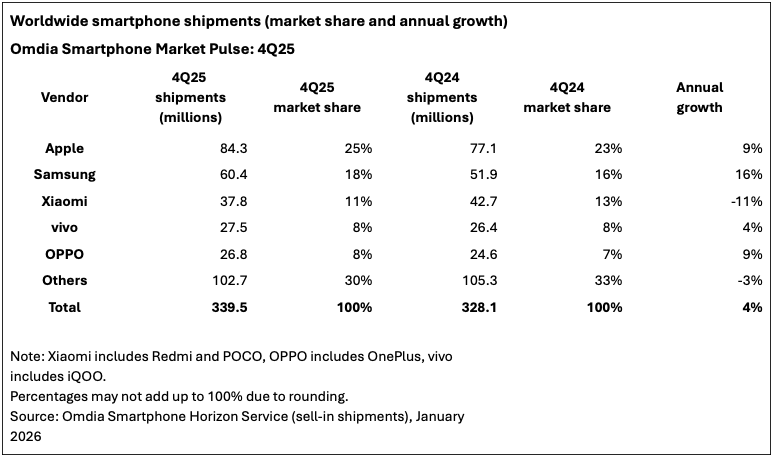 Apple behaalde in 2025 het hoogste jaarlijkse verkoopvolume ooit, met een stijging van 7% naar 240,6 miljoen iPhones. Hiermee behield het bedrijf voor het derde jaar op rij de positie als grootste smartphonefabrikant ter wereld. In het vierde kwartaal van 2025 bereikte Apple een recordkwartaalomzet, met een opvallende groei van 26% in vasteland-China, gedreven door de vraag naar de iPhone 17-serie. Samsung herstelde zich in 2025 na drie jaar van dalende verkopen en groeide met 7%, waardoor het net achter Apple eindigde. Het vierde kwartaal was bijzonder sterk, met een stijging van 16% ten opzichte van 2024, dankzij aanhoudende vraag naar premiummodellen en een herstel in het lagere segment. Samsung behield stevige verkopen van de Galaxy S- en Z-serie en won marktaandeel terug in de instap- en middenklasse.