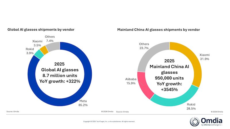 De wereldwijde verzendingen van AI-glasses bereikten in 2025 8,7 miljoen eenheden, een stijging van 322% ten opzichte van het voorgaande jaar. Deze groei wordt gedreven door een toenemende interesse in deze opkomende categorie AI-apparaten. Meta blijft de grootste speler op de markt met een aandeel van 85,2%, goed voor 7,4 miljoen verzonden eenheden en een groei van 281,3%. De Oakley- en tweede generatie Ray-Ban AI-glasses presteren sterk, mede dankzij Meta’s expansie in nieuwe markten zoals India, Mexico en Brazilië.