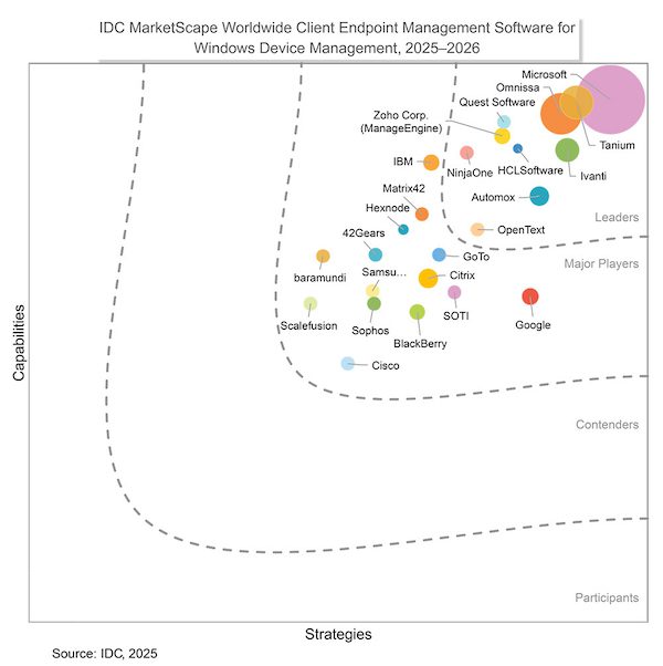 Tanium is voor de tweede keer aangemerkt als leider in de IDC MarketScape: Worldwide Client Endpoint Management Software for Windows Device Management 2025–2026 Vendor Assessment (doc #US53002929, december 2025). Volgens het rapport biedt Tanium met haar Autonomous IT Platform een geïntegreerde oplossing voor endpointbeheer, exposure management en security operations.