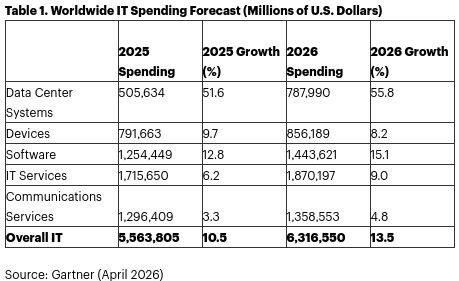 De wereldwijde uitgaven aan informatietechnologie zullen naar verwachting in 2026 uitkomen op $6.310 miljard, een stijging van 13,5% ten opzichte van 2025. Dit blijkt uit de meest recente prognose van Gartner, een bedrijf gespecialiseerd in zakelijke en technologische inzichten.
