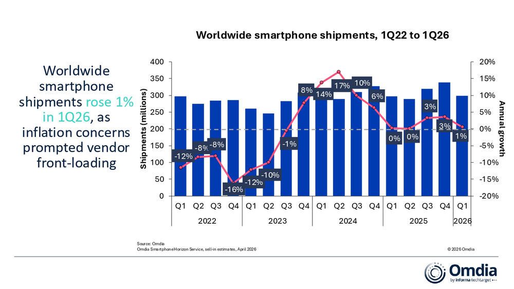 De wereldwijde smartphoneverkoop bereikte in het eerste kwartaal van 2026 een volume van 298,5 miljoen toestellen, een stijging van 1% ten opzichte van dezelfde periode vorig jaar. Volgens onderzoeksbureau Omdia werd de markt in deze periode beïnvloed door twee tegengestelde krachten. Enerzijds zorgde het vooraf inkoopbeleid van fabrikanten zoals Samsung en Apple, die hun voorraden opvoerden in afwachting van verwachte prijsstijgingen voor geheugen en componenten, voor een grotere vraag dan aanvankelijk werd verwacht. Anderzijds bleven macro-economische uitdagingen, zoals aanhoudende inflatie, de koopkracht van consumenten onder druk zetten. Hierdoor ontstond een groeiend verschil tussen de inkoop door winkels en de daadwerkelijke verkoop aan consumenten. Deze disbalans zal naar verwachting leiden tot een duidelijke correctie in het tweede kwartaal en de tweede helft van 2026.